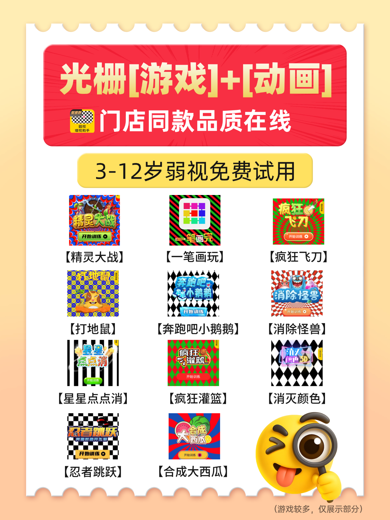 趣味游戏+动画训练 :深受弱视小朋友喜欢,小朋友能自主训练,并愿意坚持,好评不断