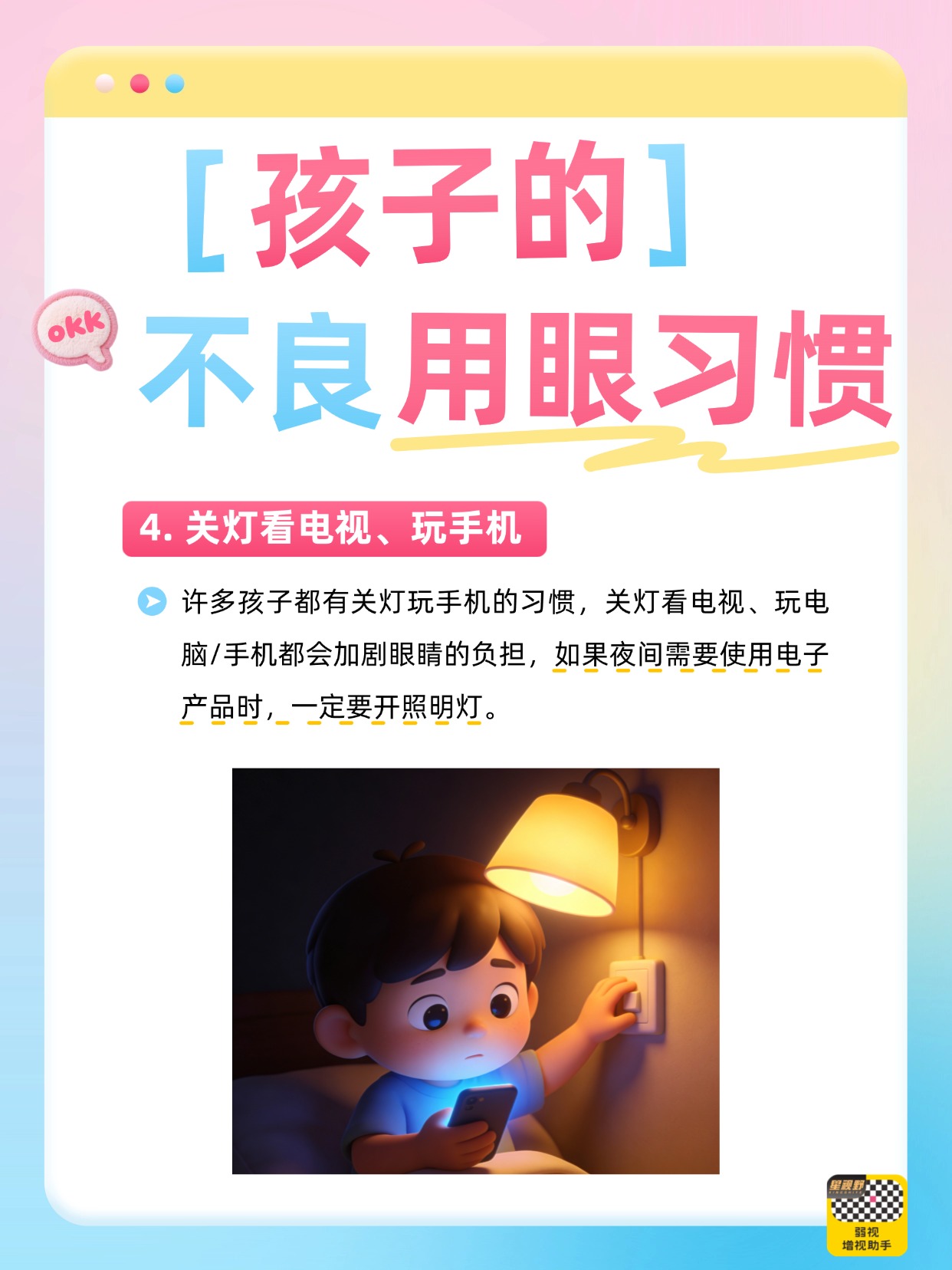 许多孩子都有关灯玩手机的习惯,关灯看电视、玩电脑/手机都会加剧眼睛的负担,如果夜间需要使用电子产品时,一定要开照明灯。