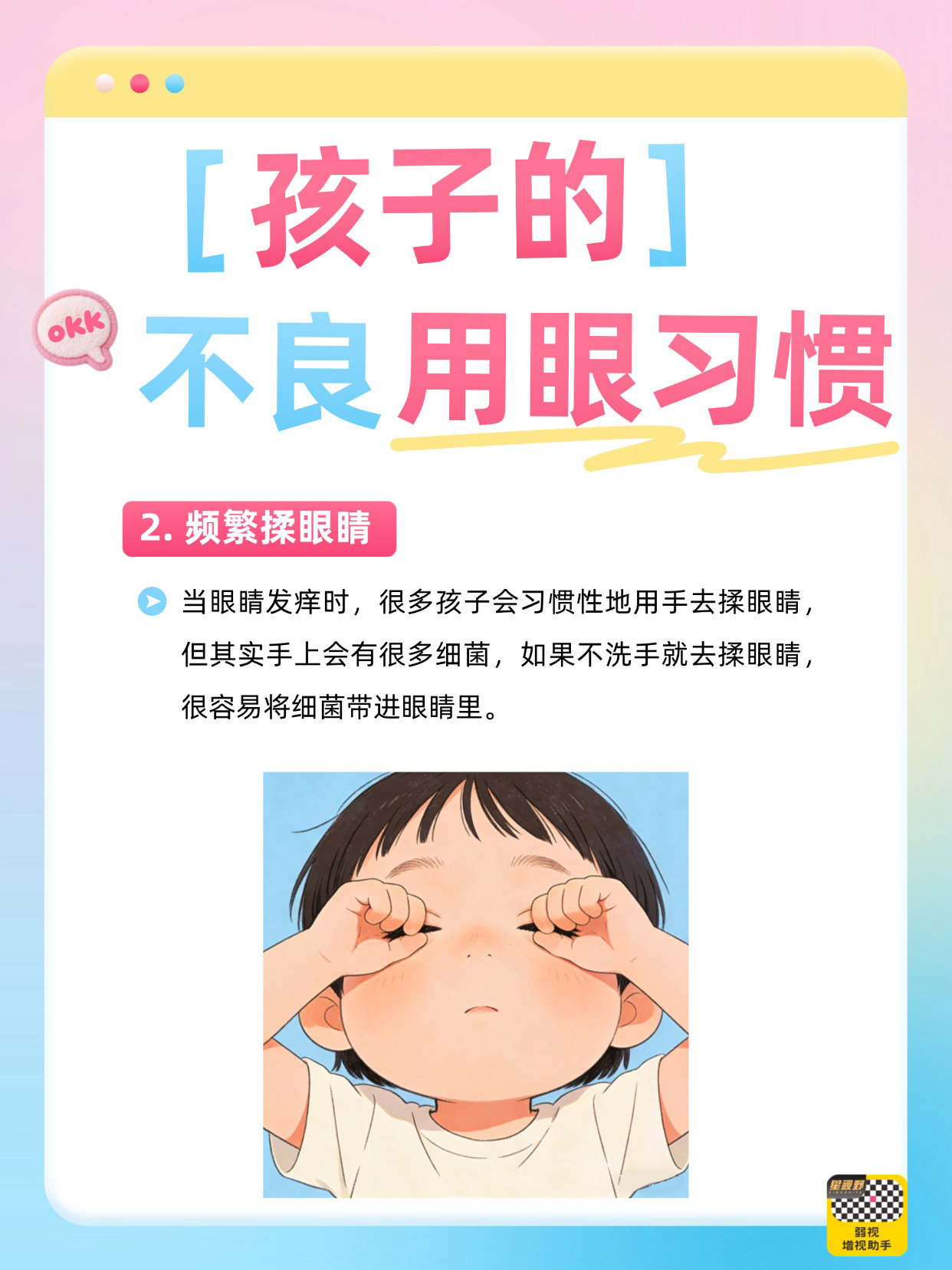 当眼睛发痒时,很多孩子会习惯性地用手去揉眼睛,但其实手上会有很多细菌,如果不洗手就去揉眼睛,很容易将细菌带进眼睛里。