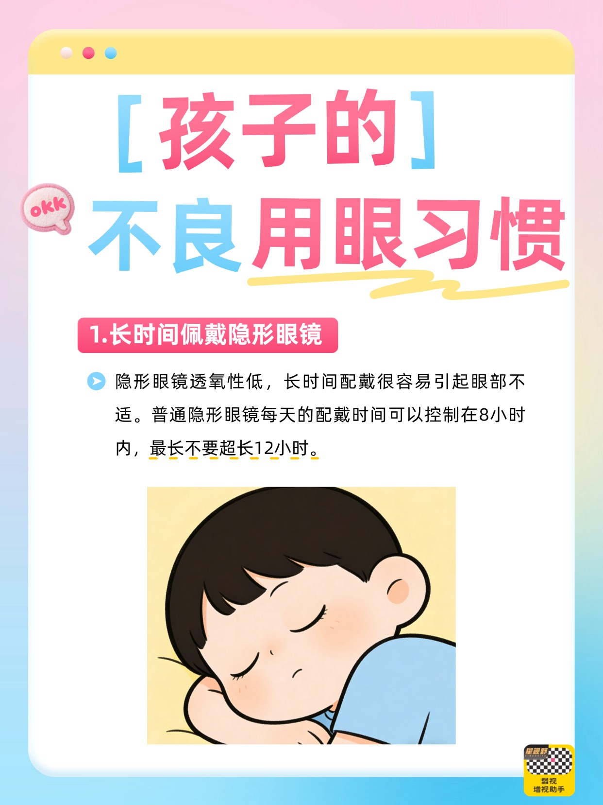 隐形眼镜透氧性低,长时间配戴很容易引起眼部不适。普通隐形眼镜每天的配戴时间可以控制在8小时内,最长不要超长12小时。