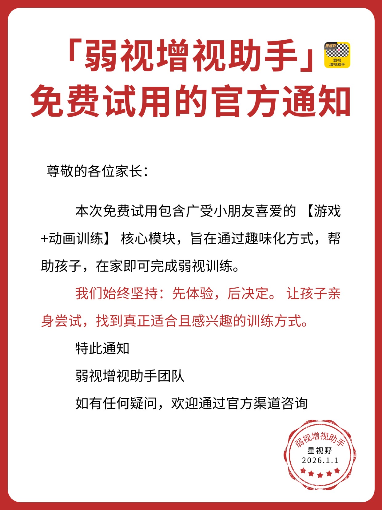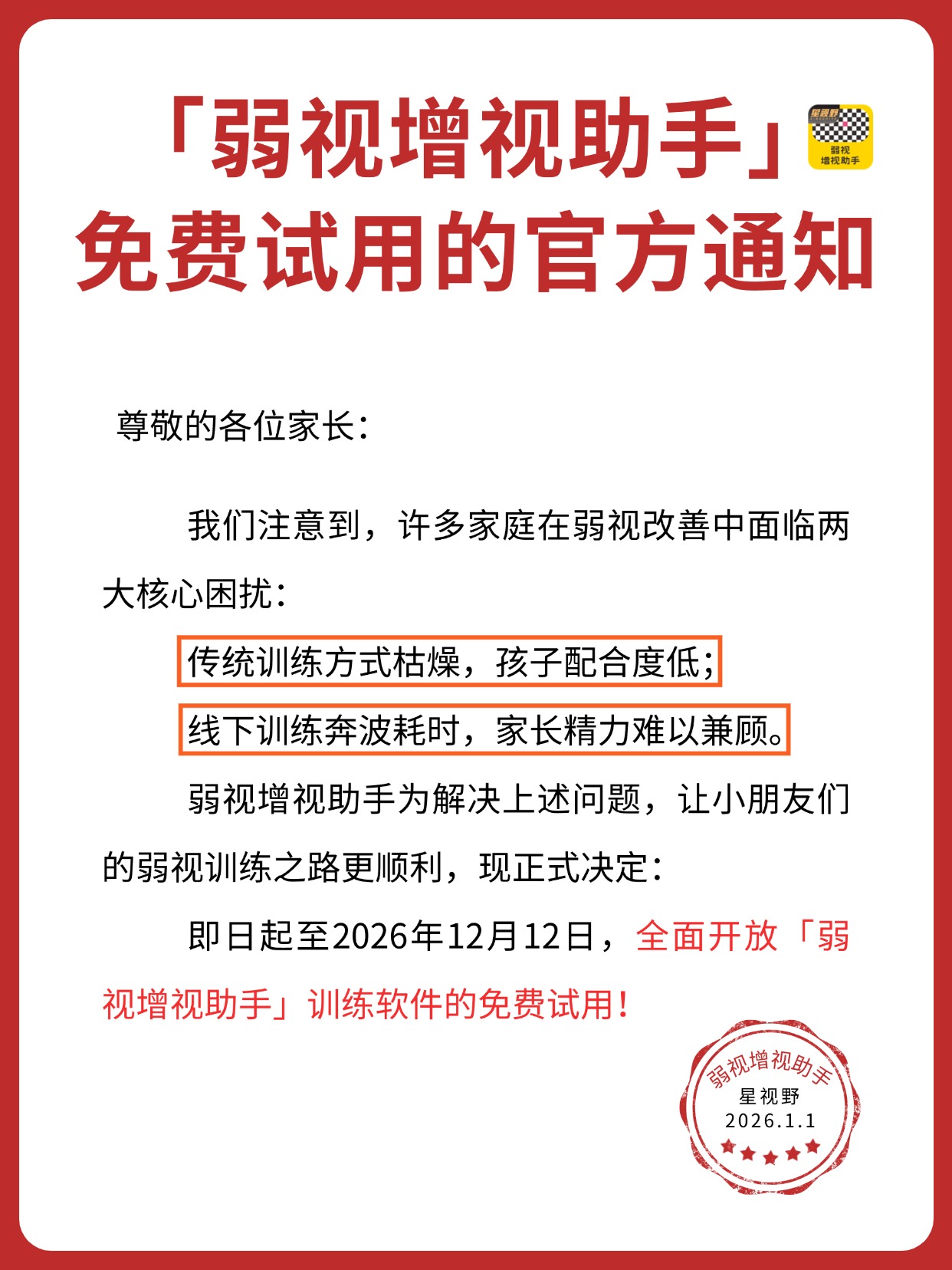 ✅即日起至2026年12月12日,全面开放「弱视增视助手」训练软件的免费试用!