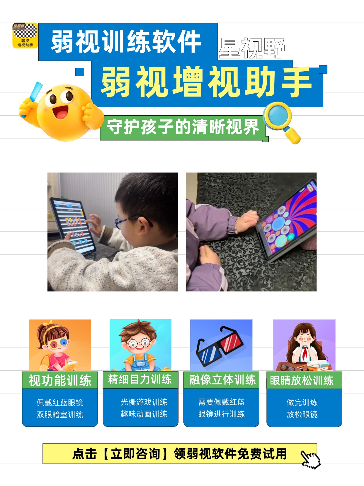 现在,弱视增视助手,免费试用活动开放中,有需要的家长,可以给小朋友报名体验哦!