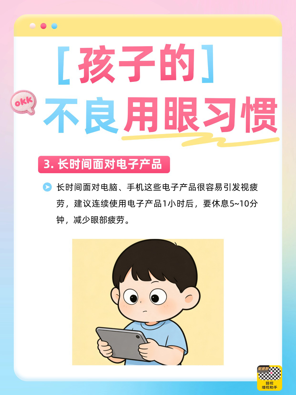 长时间面对电脑、手机这些电子产品很容易引发视疲劳,建议连续使用电子产品1小时后,要休息5~10分钟,减少眼部疲劳。