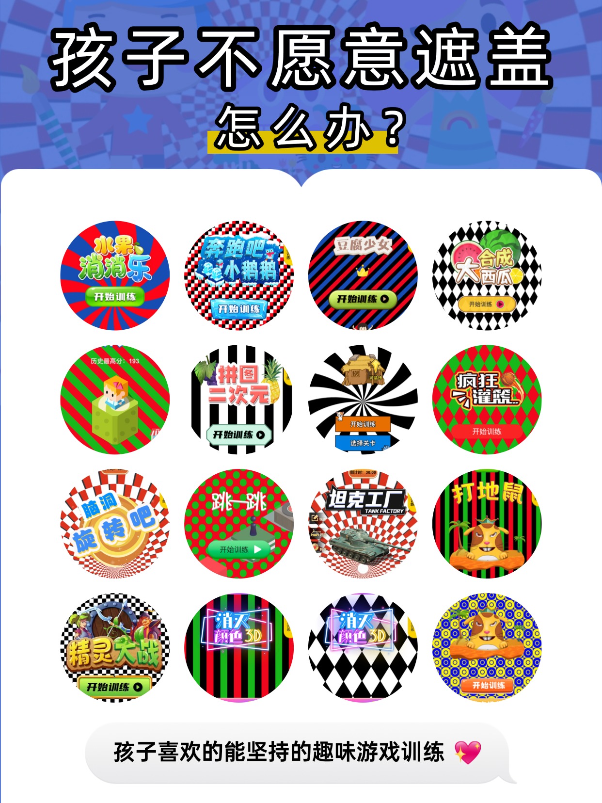 可以选择孩子喜欢的能坚持的趣味游戏训练,星视野的弱视增视助手,好玩的光栅游戏和动画,孩子喜欢不抗拒,容易坚持!